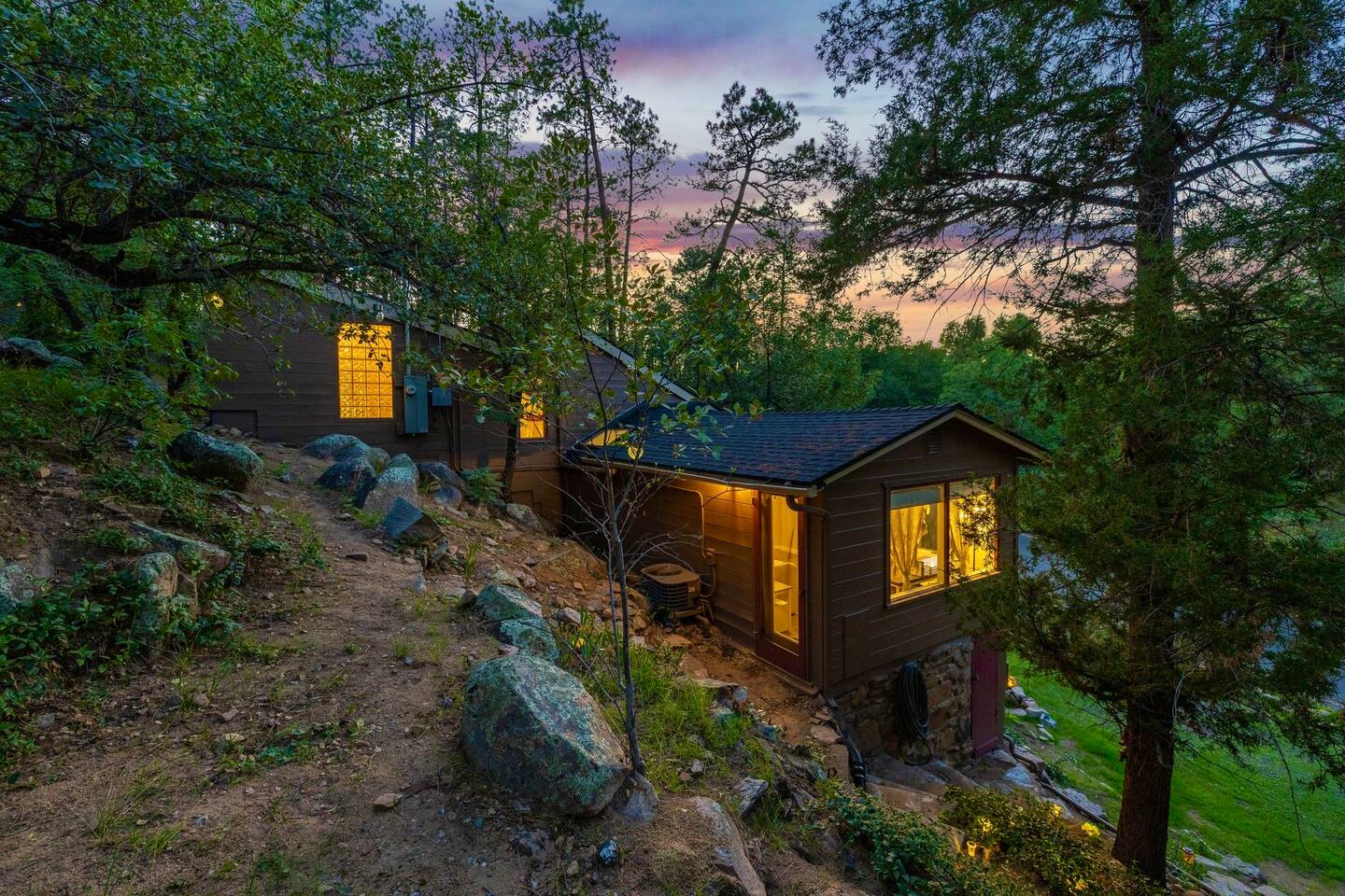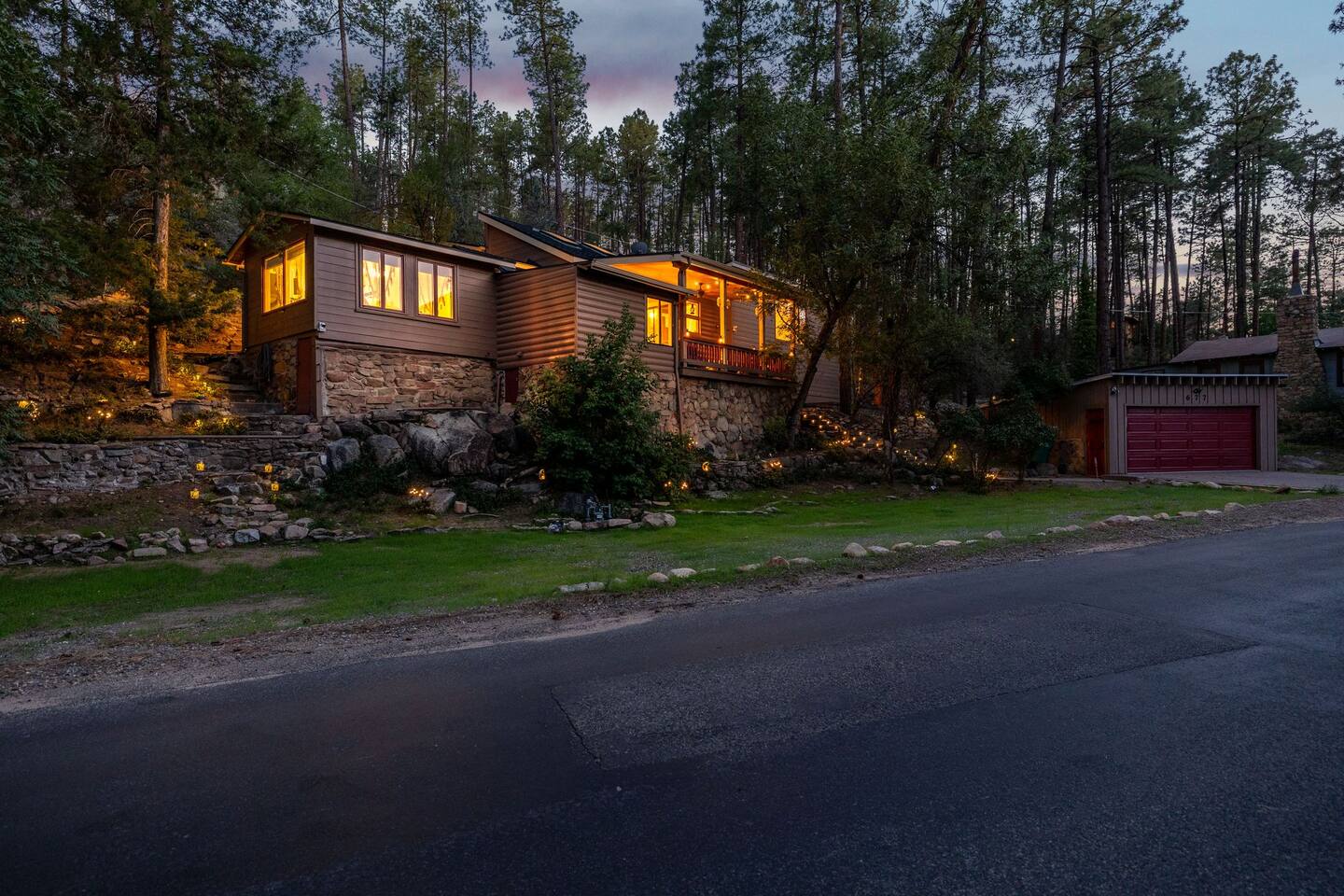 This is Prescott’s favorite vacation rental! Nestled just 5 minutes from Courthouse Plaza and Whiskey Row, it perfectly combines access to local attractions with the tranquility of the pines. This charming cabin-style retreat features 3 bedrooms, a bonus room, and 2.5 bathrooms, all adorned with cozy new furnishings and woodland decor. Families will love the whimsical Lost Boys Hideout for little adventurers, while you unwind in the enchanting ambiance that comes to life at night
