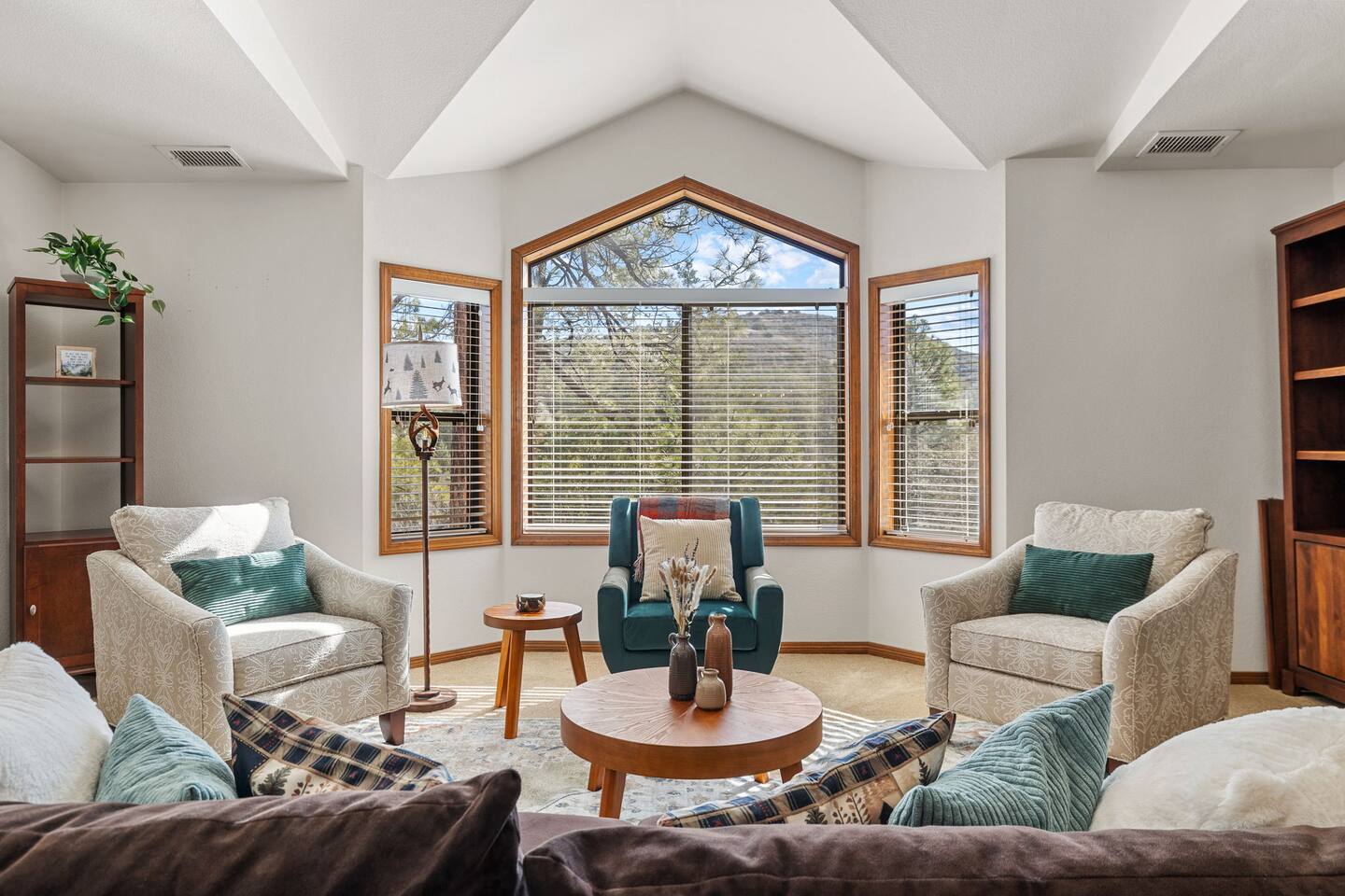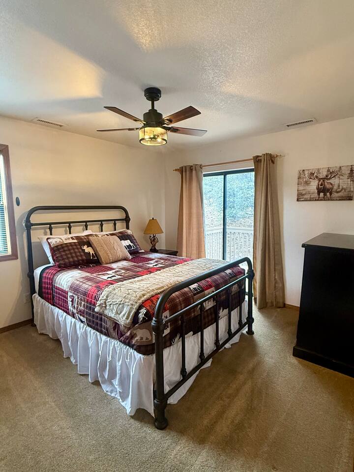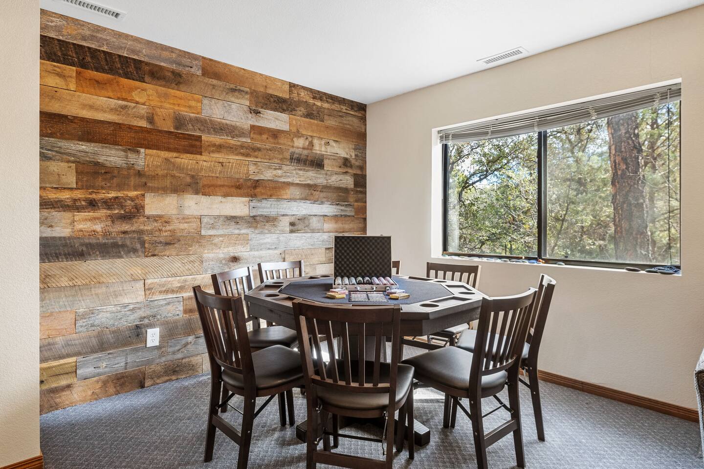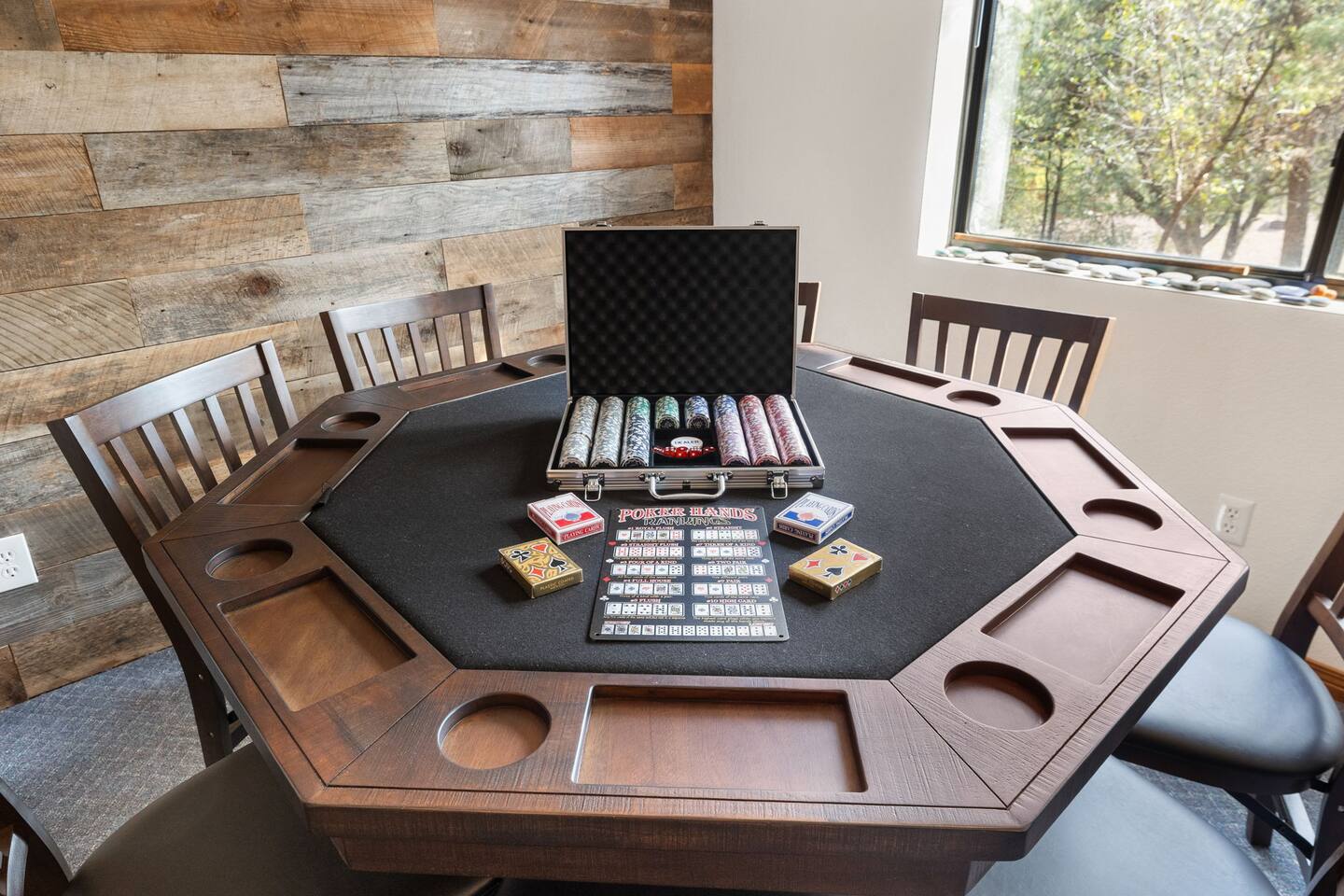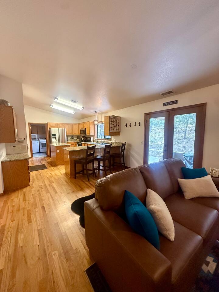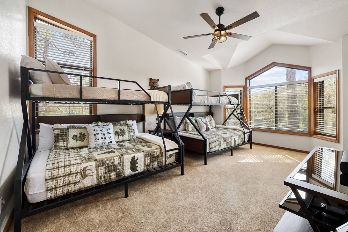 Welcome to Home Base — Luxury Forest Cabin near Prescott National Forest | Sleeps 14 A spacious, family-friendly luxury cabin in Hidden Valley Ranch — 5 bedrooms, 11 beds, 3 full baths, movie theater, game room, and easy access to trails and downtown Prescott. ** Professional Photo's Coming Soon Quick Highlights: - Sleeps up to 14 • 5 bedrooms • 11 beds • 3 full bathrooms - Master suite with king bed + ensuite bath - Two queen bedrooms; two bedrooms with twin bunk beds (4 twins each) - Fully stocked full-size kitchen (upstairs) - Upstairs living room + loft with chaise lounge and reading nook - Downstairs movie theater room + extra-large sectional - Separate game room for kids and adults - Outdoor BBQ, dining, and lounge seating in quiet pine setting - Bordering Prescott National Forest — trail access & wildlife viewing (deer, javelina, birds) - 8-minute drive to Courthouse Plaza/Whiskey Row • 6 min to Safeway • 11 min to Fry’s Full description: Upstairs you’ll find a full-size, fully stocked kitchen with everything needed to cook and serve meals, an inviting living area with multiple seating zones, and a loft with a chaise lounge and reading material for quiet downtime. The master suite features a king bed and private ensuite. Two additional bedrooms offer queen beds, and two bedrooms each have twin bunkbeds — great for kids or extra guests. All three bathrooms are full bathrooms and come stocked with shampoo, conditioner, body wash, and fresh towels for your convenience. Downstairs is built for fun: a huge sectional faces the movie theater room, and a separate game room provides extra entertainment for kids and adults alike. Outside, enjoy grilling and dining at the patio table while soaking in the serene forest surroundings and watching local wildlife. Neighborhood: Situated in an upscale, peaceful neighborhood bordering Prescott National Forest, Hidden Valley Ranch offers easy trail access and beautiful pine-lined views while staying only minutes from downtown Prescott’s restaurants and shops. Whether you want outdoor adventure or a cozy retreat, you get both. Must-knows: - Check-in: 4:00 PM - Checkout: 10:00 AM - Maximum occupancy: 14 guests - No smoking on property - No pets (please respect neighborhood safety) - Fully supplied bathrooms and kitchen essentials included Why guests love it: Space for large families, multiple hangout areas, theater + game room, and a private pine setting only minutes from downtown Prescott — perfect for family reunions, multi-family stays, or a luxury forest getaway.