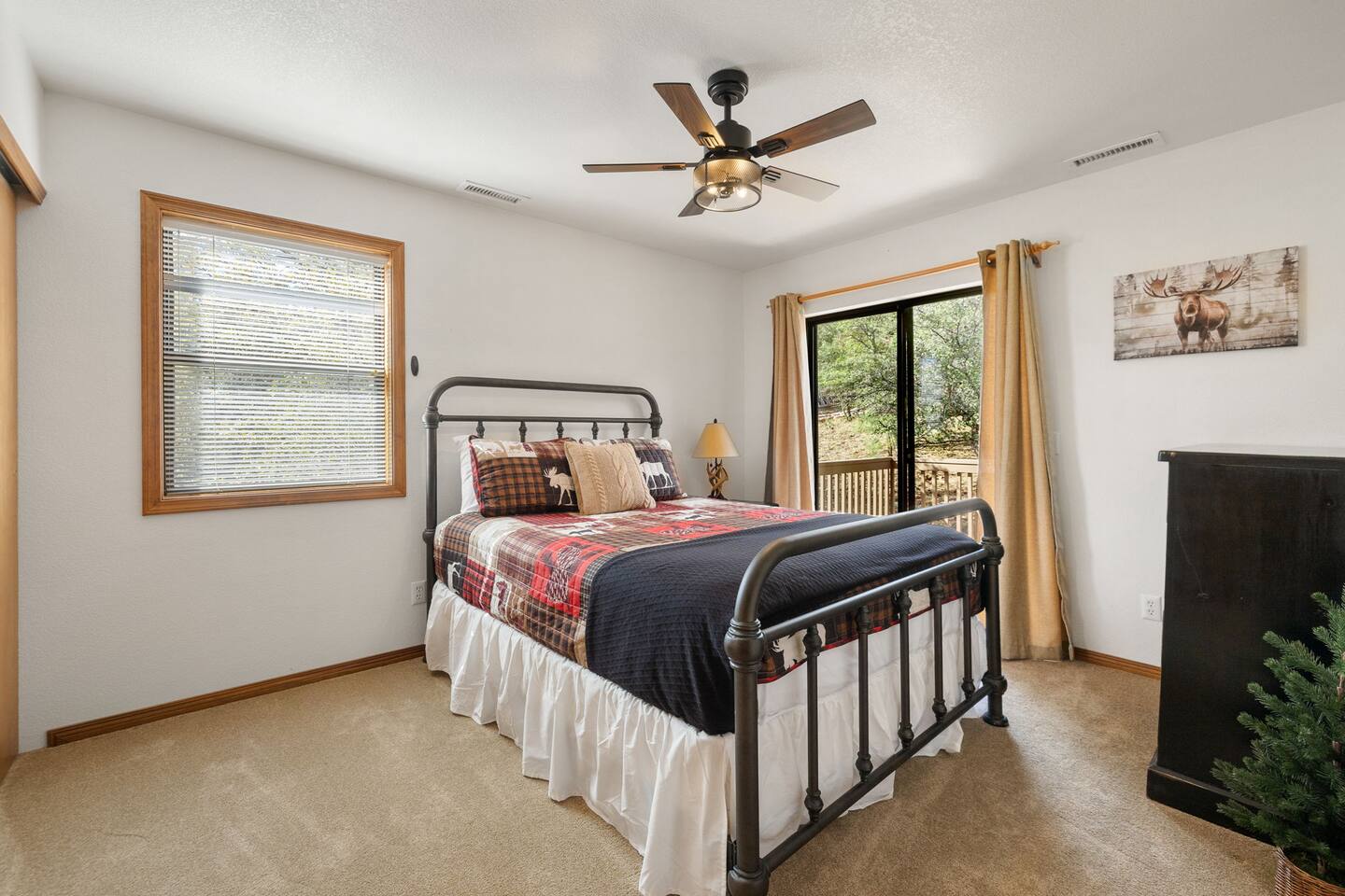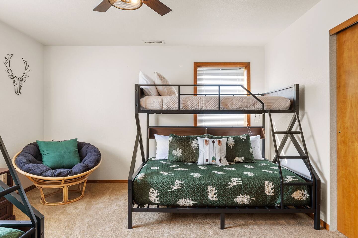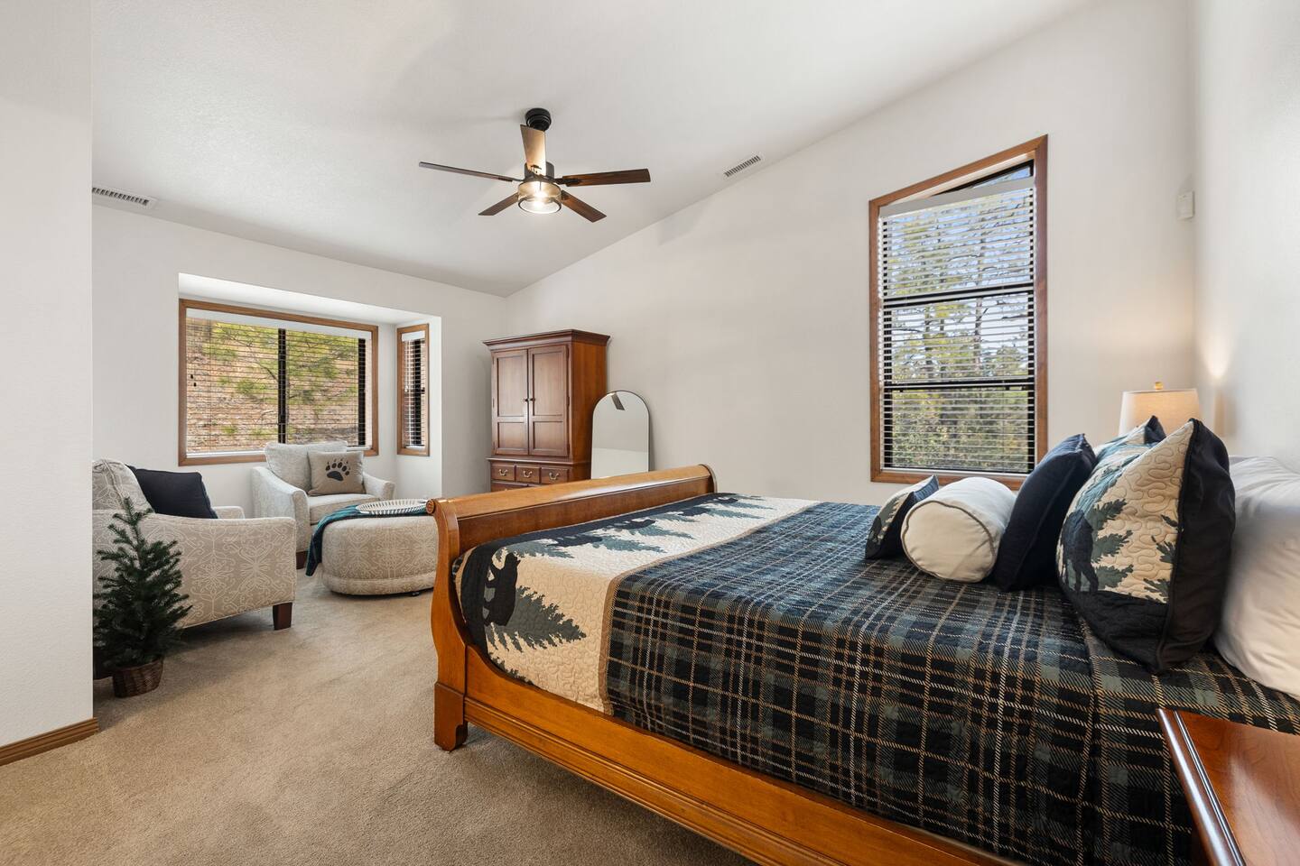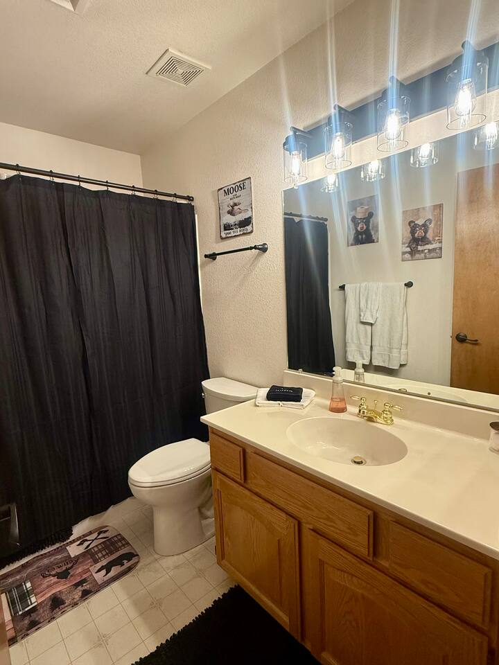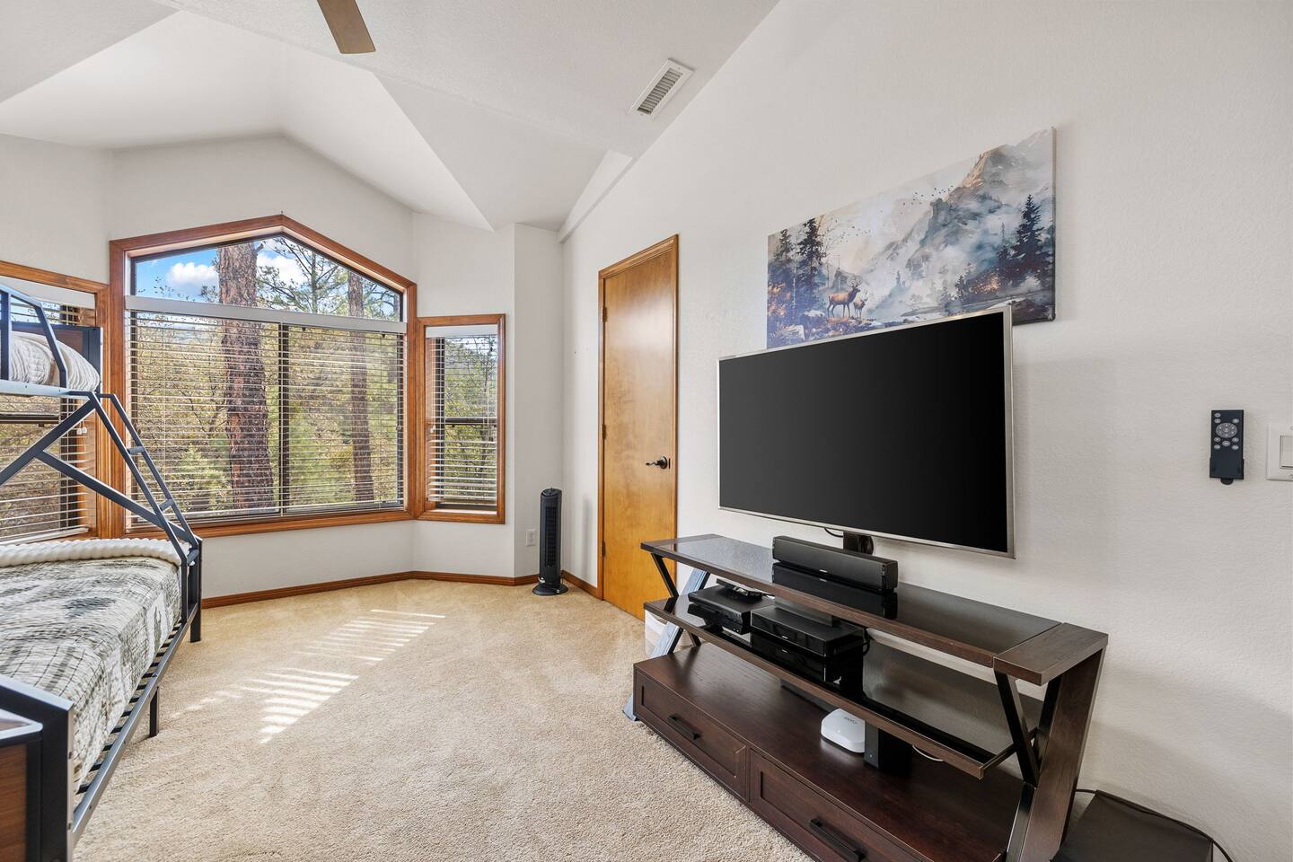 Welcome to Home Base — Luxury Forest Cabin near Prescott National Forest | Sleeps 14 A spacious, family-friendly luxury cabin in Hidden Valley Ranch — 5 bedrooms, 11 beds, 3 full baths, movie theater, game room, and easy access to trails and downtown Prescott. ** Professional Photo's Coming Soon Quick Highlights: - Sleeps up to 14 • 5 bedrooms • 11 beds • 3 full bathrooms - Master suite with king bed + ensuite bath - Two queen bedrooms; two bedrooms with twin bunk beds (4 twins each) - Fully stocked full-size kitchen (upstairs) - Upstairs living room + loft with chaise lounge and reading nook - Downstairs movie theater room + extra-large sectional - Separate game room for kids and adults - Outdoor BBQ, dining, and lounge seating in quiet pine setting - Bordering Prescott National Forest — trail access & wildlife viewing (deer, javelina, birds) - 8-minute drive to Courthouse Plaza/Whiskey Row • 6 min to Safeway • 11 min to Fry’s Full description: Upstairs you’ll find a full-size, fully stocked kitchen with everything needed to cook and serve meals, an inviting living area with multiple seating zones, and a loft with a chaise lounge and reading material for quiet downtime. The master suite features a king bed and private ensuite. Two additional bedrooms offer queen beds, and two bedrooms each have twin bunkbeds — great for kids or extra guests. All three bathrooms are full bathrooms and come stocked with shampoo, conditioner, body wash, and fresh towels for your convenience. Downstairs is built for fun: a huge sectional faces the movie theater room, and a separate game room provides extra entertainment for kids and adults alike. Outside, enjoy grilling and dining at the patio table while soaking in the serene forest surroundings and watching local wildlife. Neighborhood: Situated in an upscale, peaceful neighborhood bordering Prescott National Forest, Hidden Valley Ranch offers easy trail access and beautiful pine-lined views while staying only minutes from downtown Prescott’s restaurants and shops. Whether you want outdoor adventure or a cozy retreat, you get both. Must-knows: - Check-in: 4:00 PM - Checkout: 10:00 AM - Maximum occupancy: 14 guests - No smoking on property - No pets (please respect neighborhood safety) - Fully supplied bathrooms and kitchen essentials included Why guests love it: Space for large families, multiple hangout areas, theater + game room, and a private pine setting only minutes from downtown Prescott — perfect for family reunions, multi-family stays, or a luxury forest getaway.