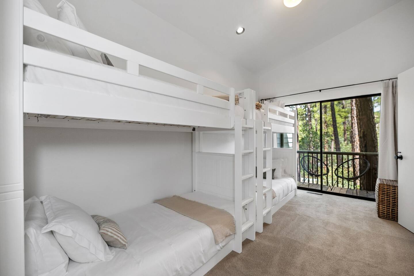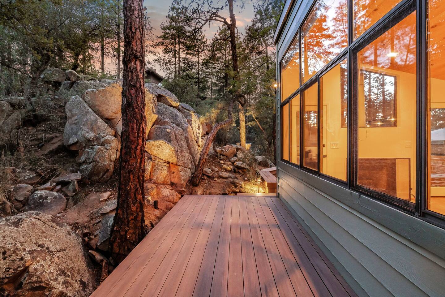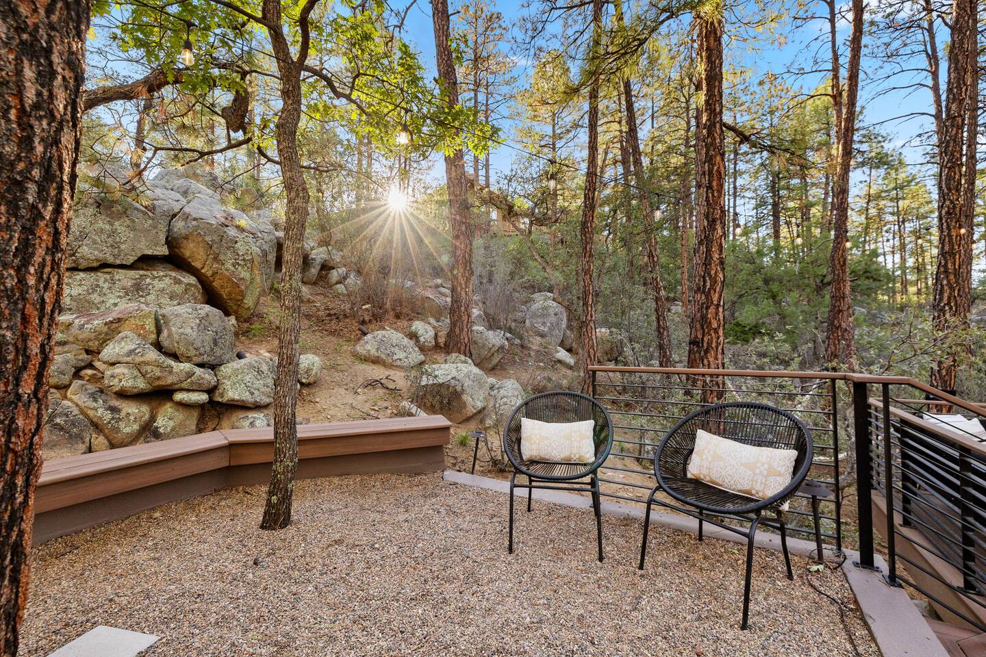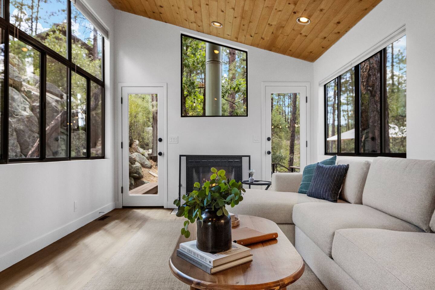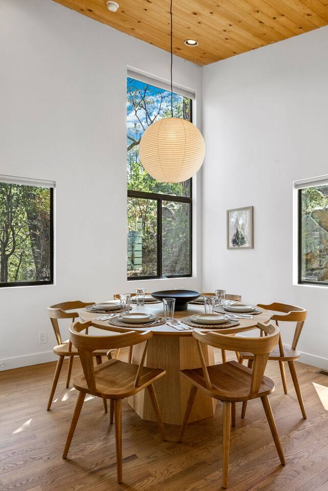 **Newly Relisted** Our property had nearly 90 five‑star reviews. The previous local managers sold their company to an out‑of‑state provider, so we have reintroduced the home under the new listing, with incredible new co-hosts. All local:) Key features - 4 bedrooms, 3 baths with hotel-quality linens and comfortable mattresses - 2 primary suites with king beds (one with en‑suite bath) - 2 private bunk bedrooms (Twin XL and twin configuration) — upper bunks reserved for those under 150 lbs for safety - 2 bedrooms and both living areas with smart TVs - High-speed Wi‑Fi and a dedicated laundry room with new machines - Multiple decks with lounge furniture; parking for up to 3 cars - Complimentary Public Goods toiletries in all bathrooms What guests say "Beautiful and peaceful — spotless, well appointed, and perfect for hiking and town visits. Five stars." — Maria "One of the most beautiful stays — comfortable, hotel-grade amenities, and great for families." — Alexandra Bedrooms Each room is designed for rest: room‑darkening shades, fans, ample storage, and thoughtful touches. Bedrooms are arranged to provide privacy, making the home ideal for two families or groups. Bathrooms Three well-appointed bathrooms with plush towels, hairdryers, and premium toiletries. The en‑suite features double vanities, a luxury shower, and quartzite counters. Other baths include a tub/shower combo and generous vanities with abundant natural light. Kitchen & dining Remodeled kitchen with quartzite counters, stainless appliances, a 6‑burner gas range, and full cookware. Vaulted ceilings and large windows overlook the pines; seating at a custom round oak table for shared meals. Coffee options include Keurig, drip, and pour‑over. Living spaces Two distinct living areas: a cozy library/theater room with a down sectional, record player, books, games, and a large smart TV; and a bright vaulted living room with a fireplace and expansive windows framing moss‑covered boulders and treetops. Outdoors Five decks, including bedroom decks, a BBQ deck, and a cantilevered entertaining deck with seating and dining. Large backyard with hammocks and safe climbing boulders for kids. Extras - Ping pong, cornhole, and family-friendly games - Parking for up to three cars Book a calm, comfortable stay surrounded by Ponderosa pines.